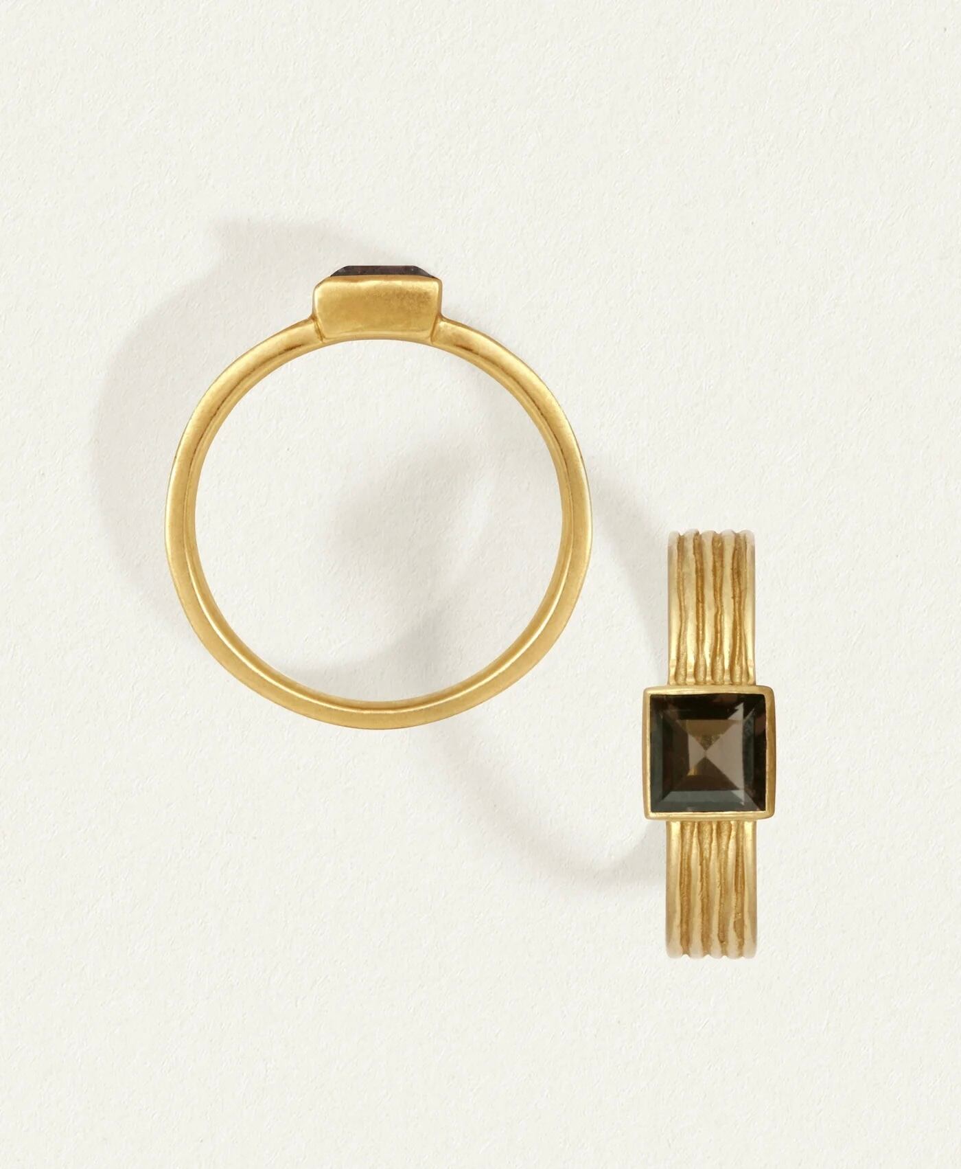 古代スパルタ人のミニマリストの美学を反映したこの18kゴールドヴェルメイユソリティアリングは、プリンセスカットのスモーキークォーツが支配するテクスチャバンドを特徴としています。